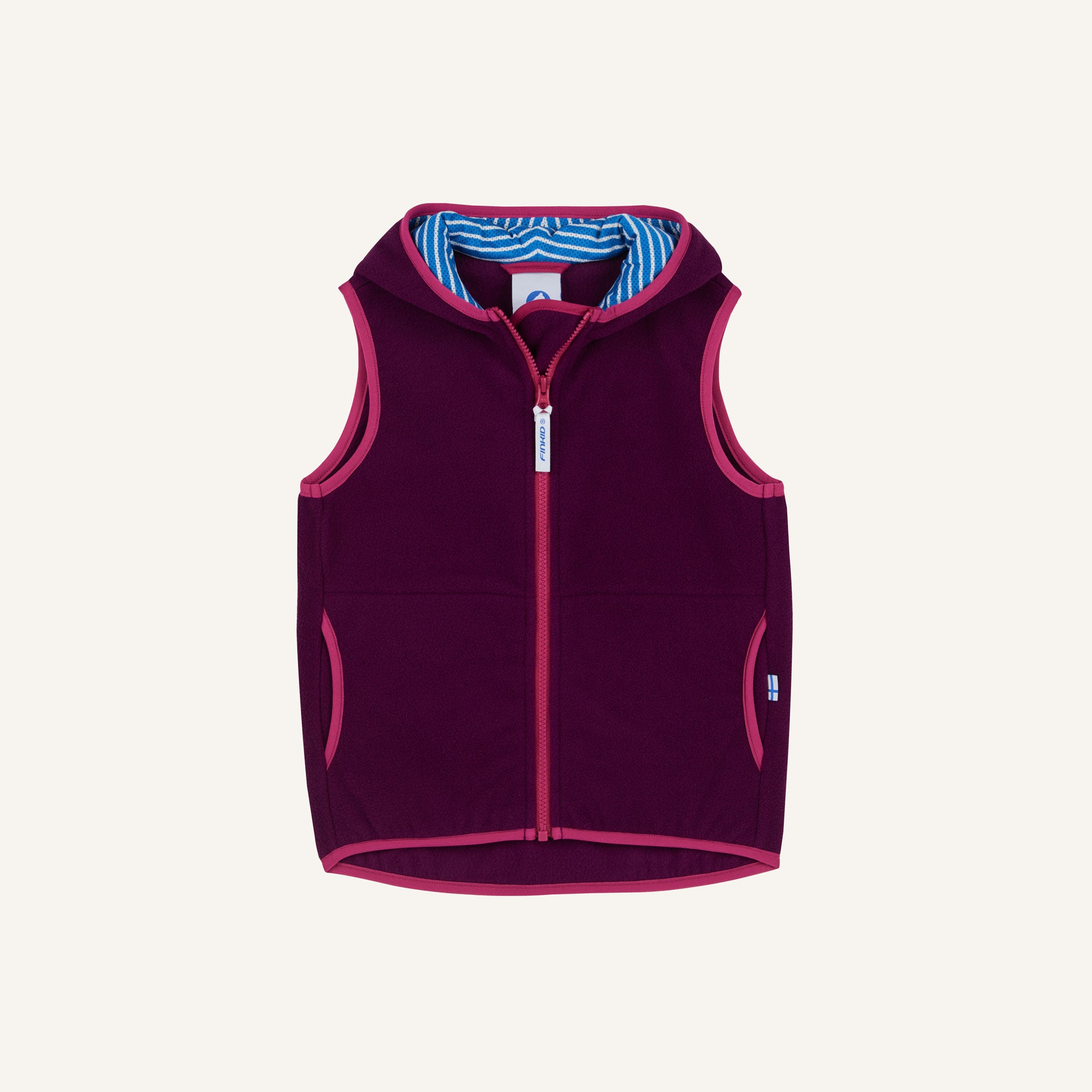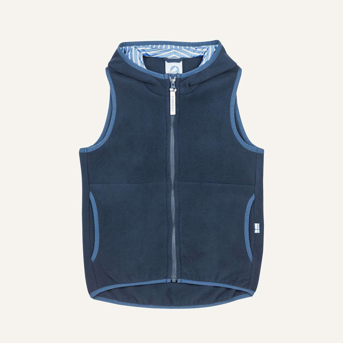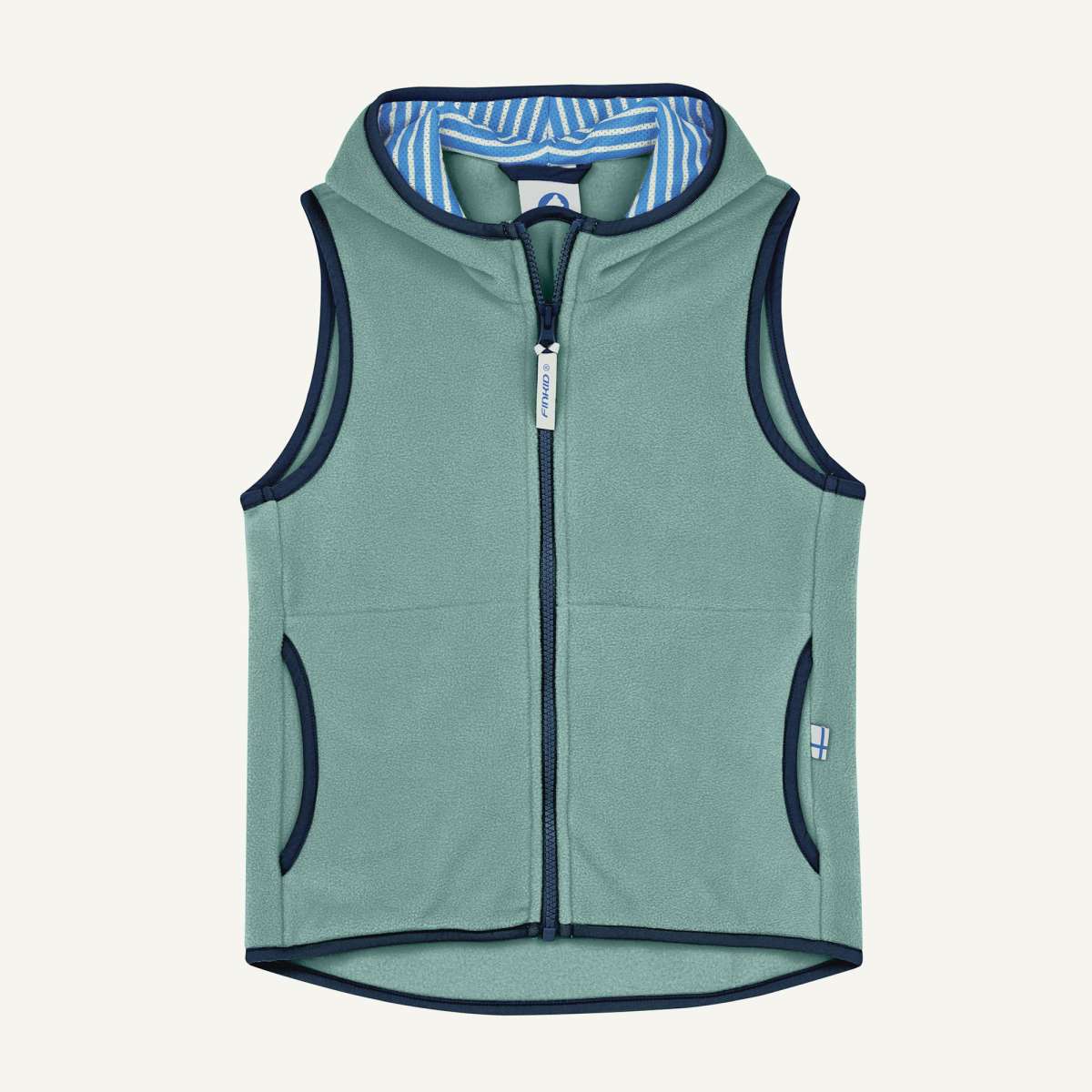 Sky blue and white stripes like the hood's inner lining – the vastness of the sky and the beach are always with you when POPPELI is out and about. Our fleece vest with the finkid dwarf hood warms the torso and leaves the arms free for digging, searching for shells, and scooping up nets. It features a mesh lining. It can also be combined as a zip-in inner jacket.
