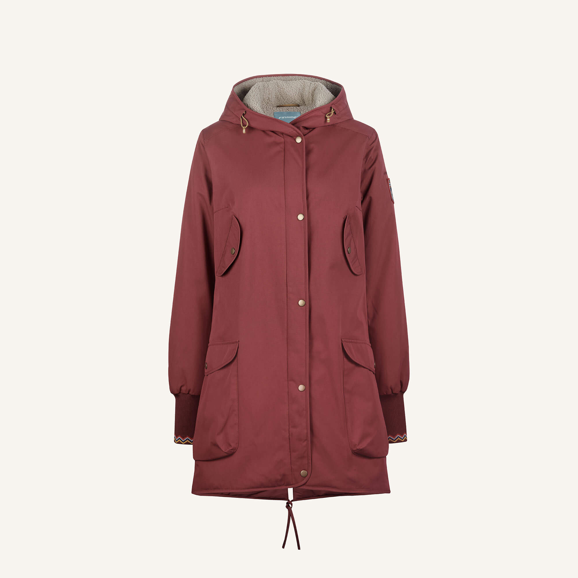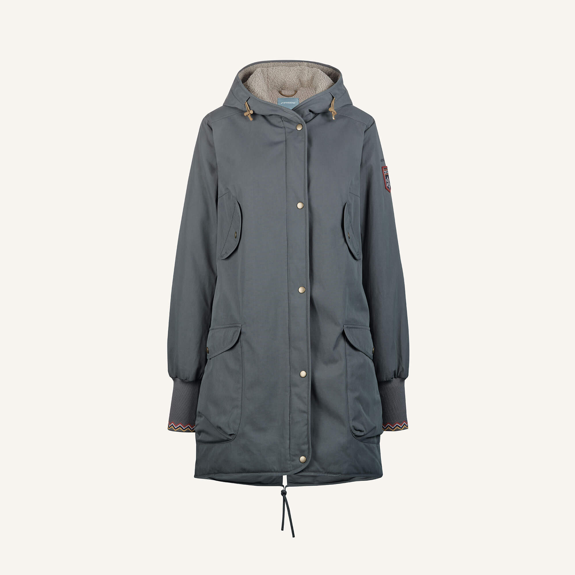 IVALUKKA is a women's winter parka made from water-repellent cotton fabric for a natural look and lined with soft shepherd's teddy fleece—ideal for cool autumn and winter days. The relaxed fit, chest pockets, curved hemline, and spacious hood ensure a comfortable fit and a feminine look. Long ribbed cuffs with a subtle folksy pattern on the sleeves provide additional protection from wind and cold. Available in sizes 34 to 44. From finside.