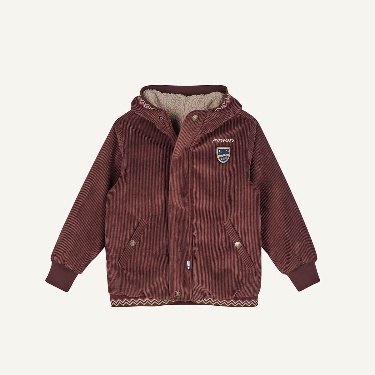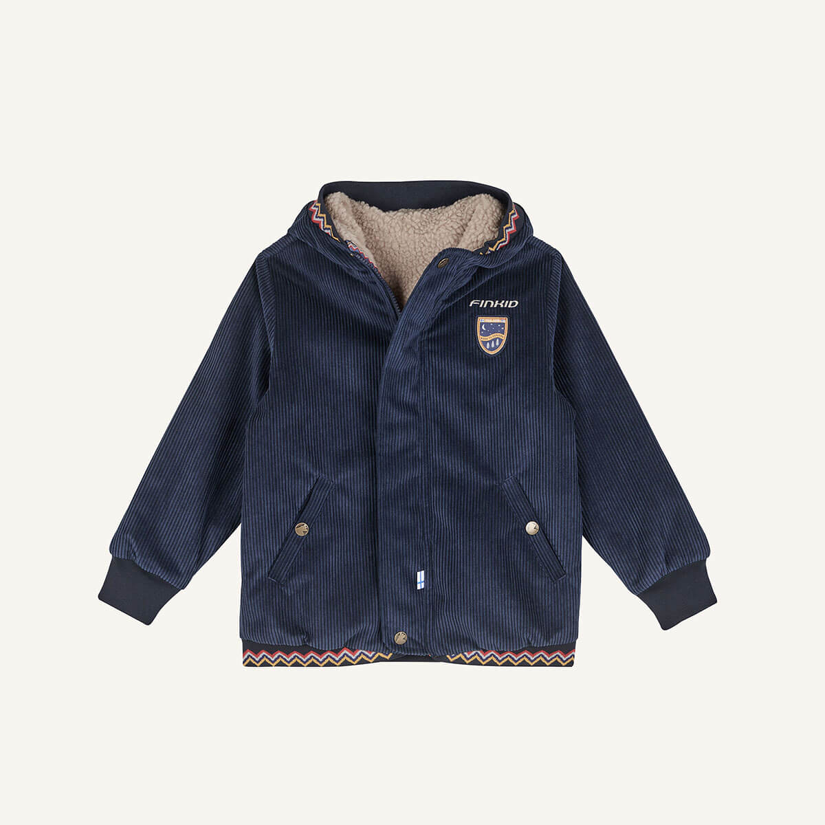 JUURI CORD is a reversible corduroy jacket for children with charming Finnish folksy details that perfectly combines function and style. The jacket is waterproof, windproof, breathable, and insulating—ideal for the cooler seasons. Sealed seams and robust construction ensure reliable weather protection. The interior is made of cozy teddy fleece for an extra dose of comfort, whether inside or out. Starting in size 120/130, JUURI CORD features a round hood. Made from environmentally friendly materials with a PFC-free finish. Available in sizes 90/100 to 140/150. From finkid®.