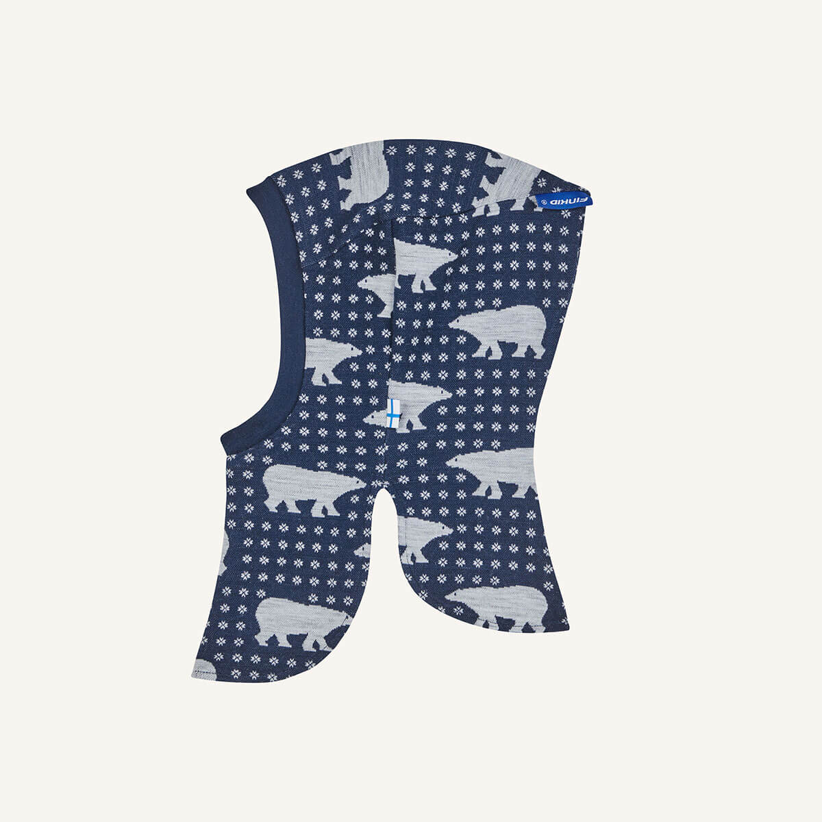 LUOLA NORDIK is a cozy wool balaclava for children with a cute bear pattern. Lined with soft cotton jersey, it reliably protects the head, ears, and neck from cold and wind. The breathable, heat-insulating wool material ensures a comfortable fit – perfect for cold fall and winter days. The practical pull-on design stays securely in place, even when moving. Available in sizes S, M, and L. From finkid®.