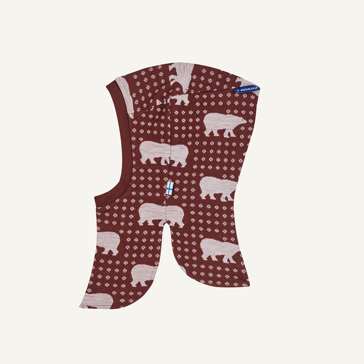 LUOLA NORDIK is a cozy wool balaclava for children with a cute bear pattern. Lined with soft cotton jersey, it reliably protects the head, ears, and neck from cold and wind. The breathable, heat-insulating wool material ensures a comfortable fit – perfect for cold fall and winter days. The practical pull-on design stays securely in place, even when moving. Available in sizes S, M, and L. From finkid®.