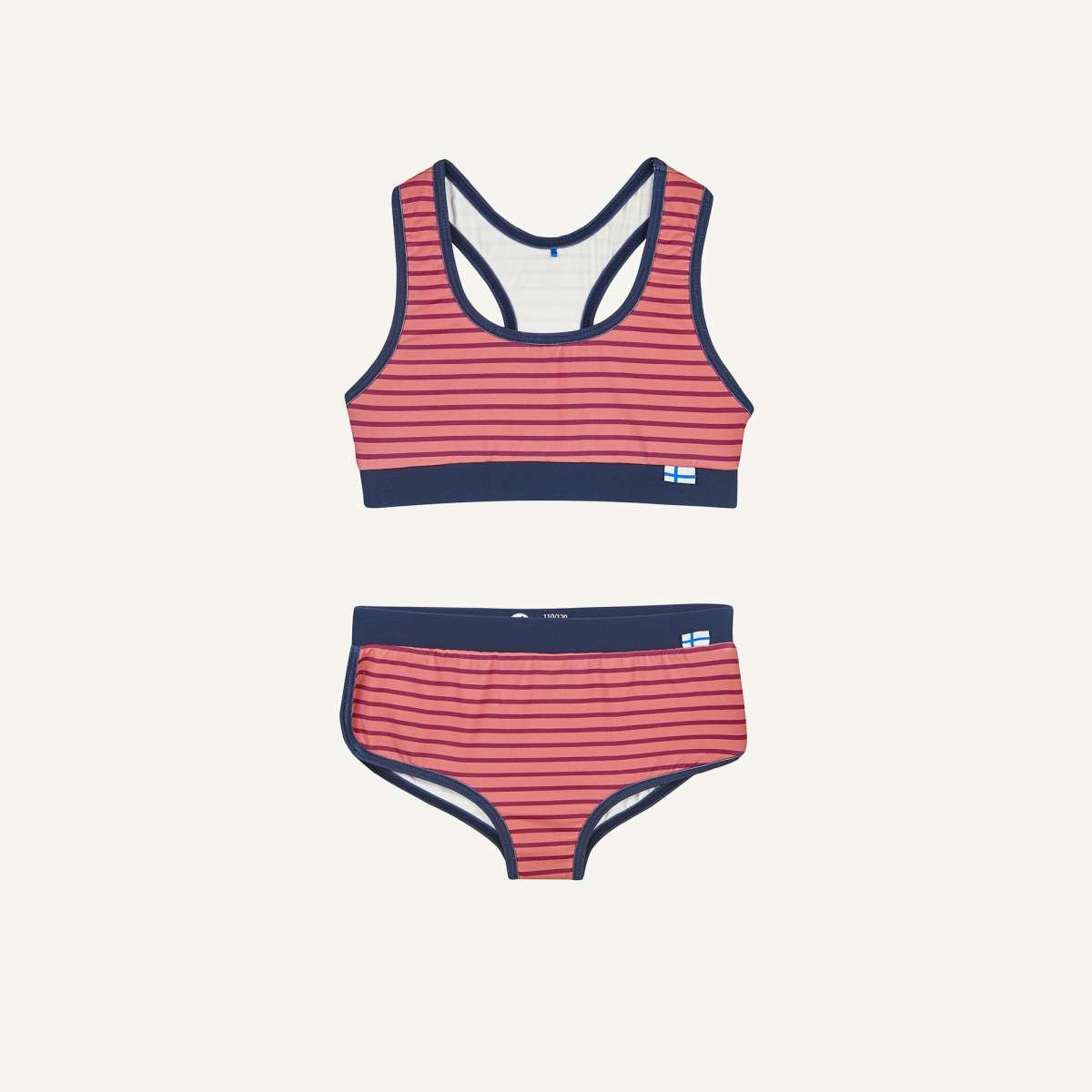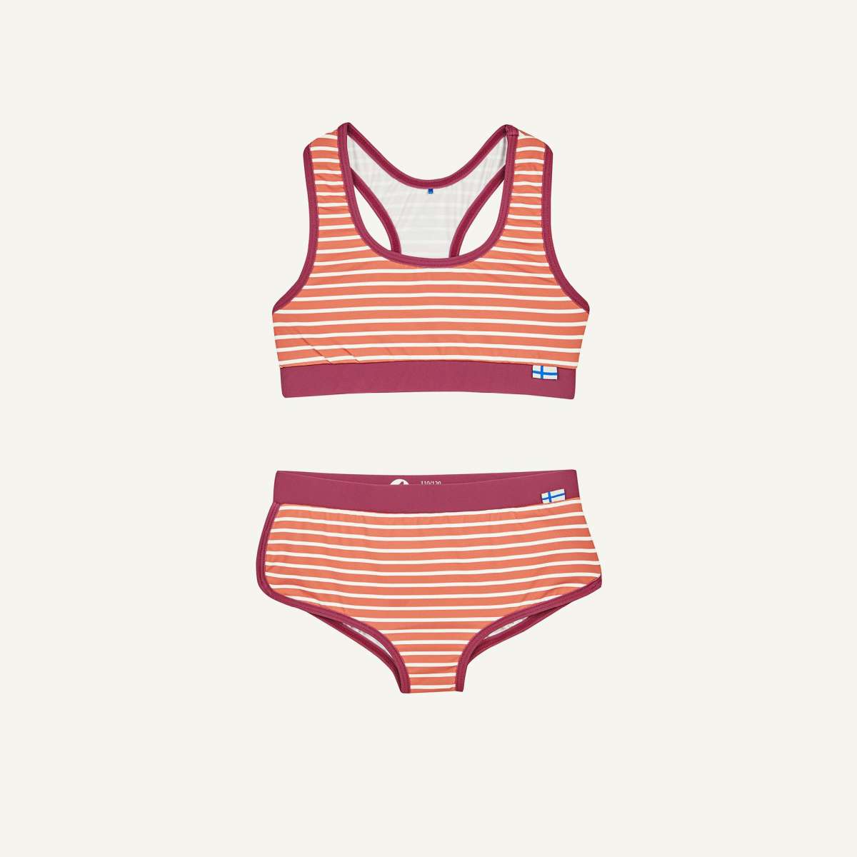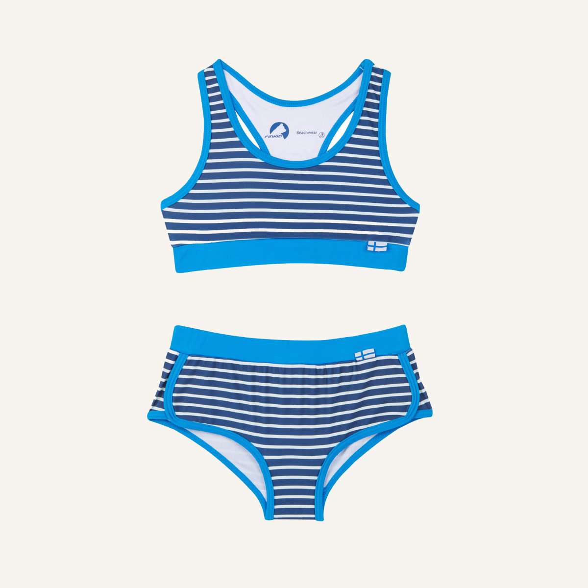 Am Strand ist einfach alles besser. Oder im Schwimmbad. Oder am See. Und mit dem LUOTO Bikini Set stimmt dabei auch das Outfit. Das zweiteilige Set aus Oberteil und Pants gibt es in zwei verschiedenen Ringelmustern, das Material ist schnelltrocknend und mit Lichtschutzfaktor 50+ versehen. Perfekt für lange Sommertage am Wasser.